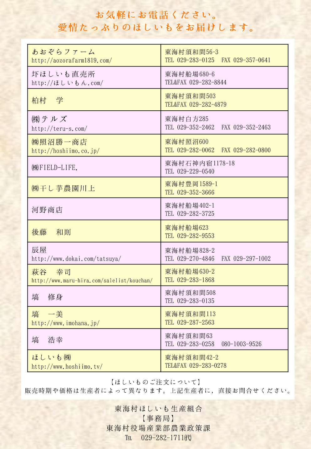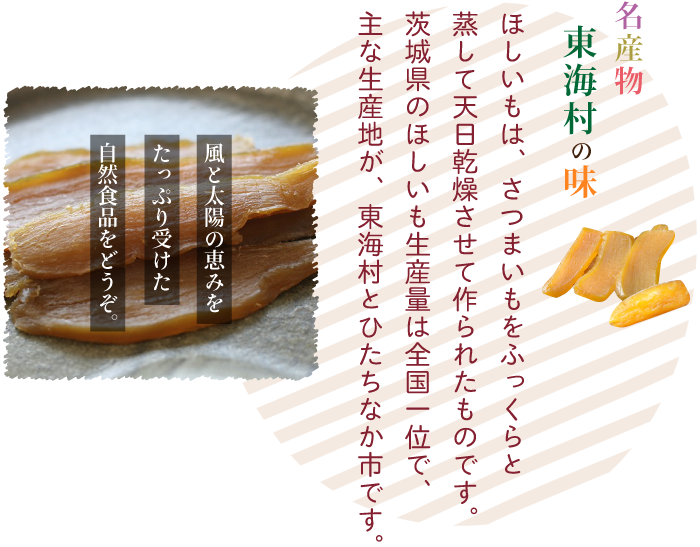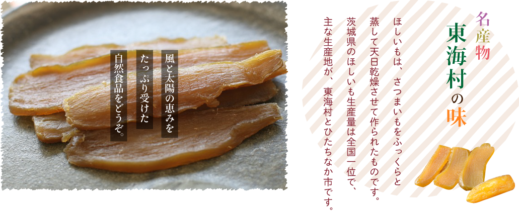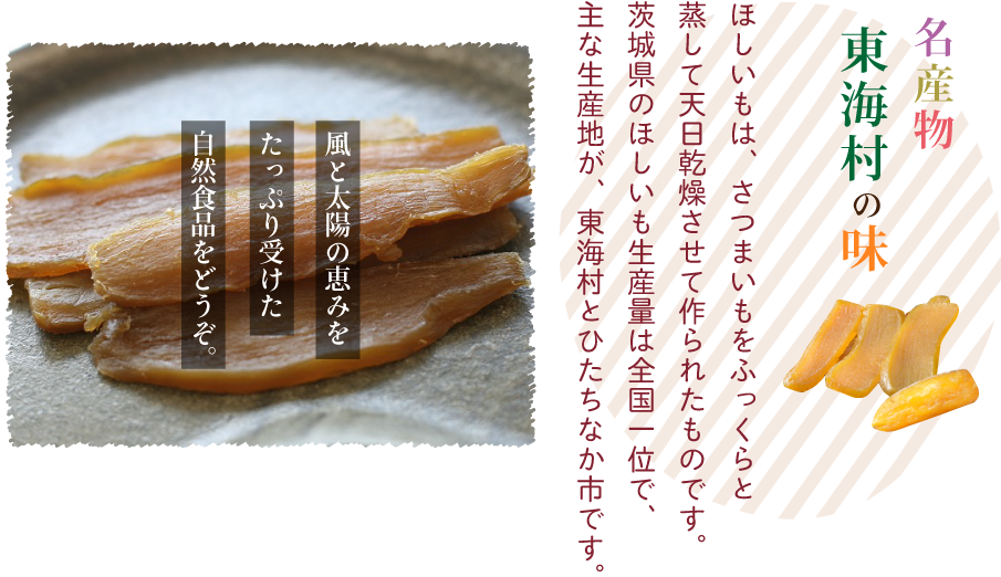 原料いもの栽培環境や、加工時期の気温等が生産に適しているため、茨城県のほしいもは全国でも1位の生産量で、特に東海村と隣接するひたちなか市が盛んです。