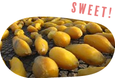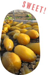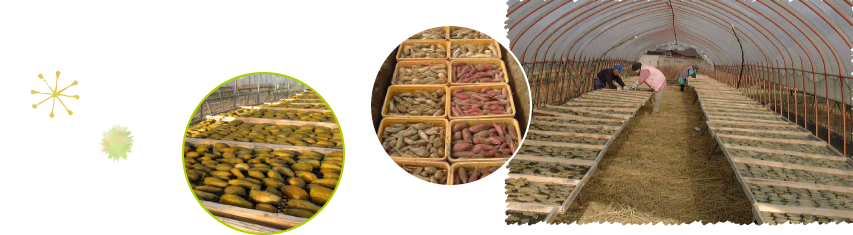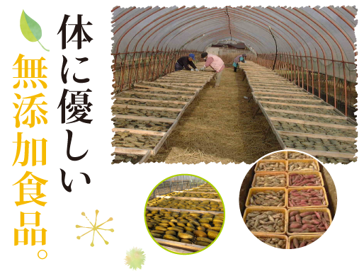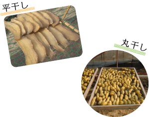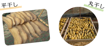 ほしいもには平干しと丸干しの二種類があります。 写真の平干しはまだ干したばかりですが、さらに1週間程度天日に干すことによって、甘みが増していきます。