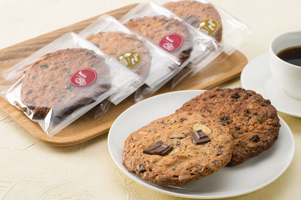 甘さ控えめ、一枚で満足するサイズ、2つの違った食感をお楽しみください。