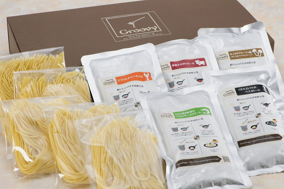 グルービー全店舗より厳選した5種類のパスタを贈答用に作りました。ぜひおためしください。