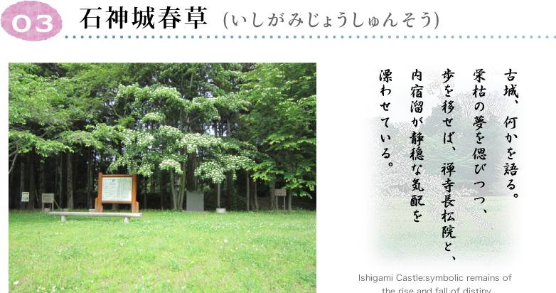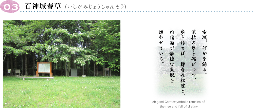 石神城は、慶長七年(1602)に、小野崎氏が秋田に赴くとともに廃城(天正五年)となり、村民の憩いの場の城址公園となっています。