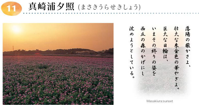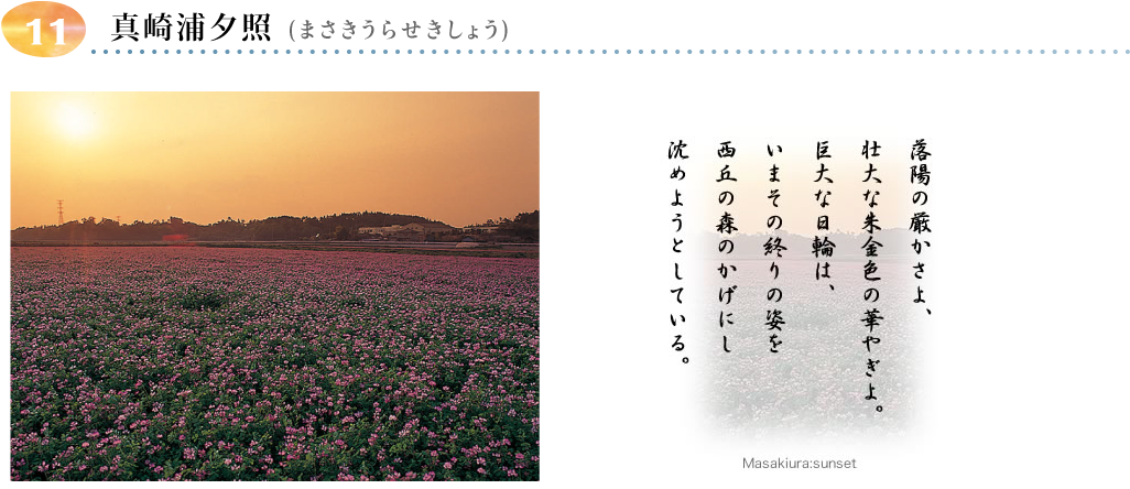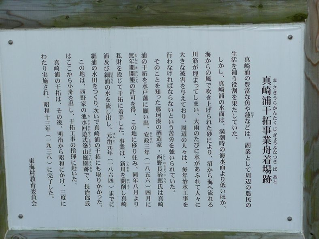 真崎浦は,須和間,照沼,長砂,足崎,高野にまたがる周囲約4.5km、東西2km、南北800m、面積約136ha、水深4から5mの沼地でした。鎌倉時代までは村松海岸の入り江であったが,久慈川からの土砂流出,黒潮や北東の風によって運ばれた砂が村松砂丘を発達させ,入り口を埋めて潟湖化したものといわれています。 安政三年に開拓事業に着手し,さまざまな時変により途中中断しながら,昭和13年に干拓事業は完了しました。現在は黄金色に輝く広大な水田地帯となっています。写真(転作のレンゲ)