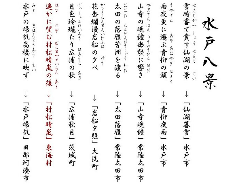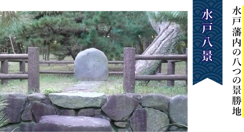 水戸八景とは、水戸徳川家第九代藩主斉昭公が、天保四年(1833年)に水戸藩内を巡視し八つの景勝地を選定したものです。選ばれた地には、斉昭公自筆の碑が建てられました。東海村では、村松の地「村松晴嵐」が選ばれています。